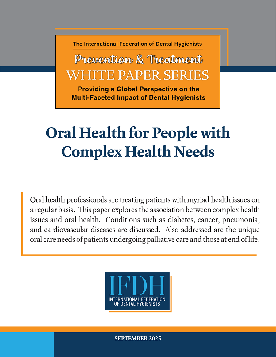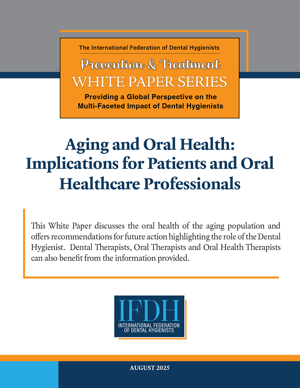 This White Paper discusses the oral health of the aging population and offers recommendations for future action, highlighting the role of the Dental Hygienist. Dental Therapists, Oral Therapists and Oral Health Therapists can also benefit from the information provided.