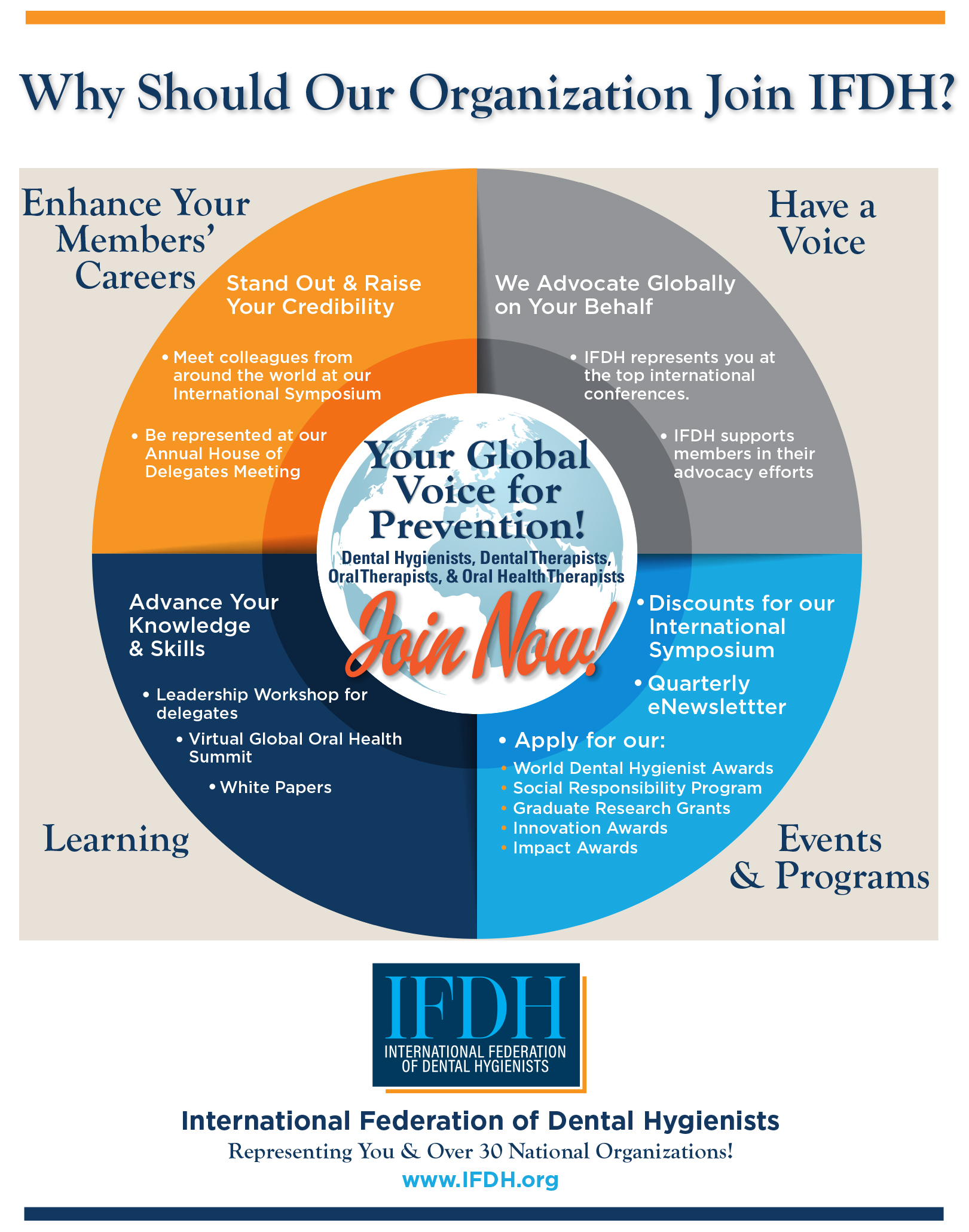 Students who support the Federation’s policies and who show written proof of enrolment in an accredited minimum two-year program in Dental Hygiene, Dental Therapy, Oral Therapy, or Oral Health Therapy can join the IFDH at a reduced annual fee.